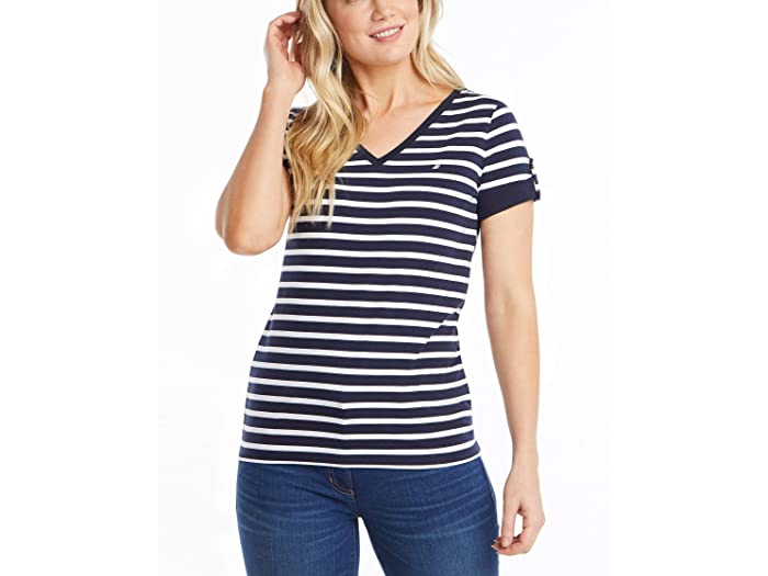 (取寄) ノーティカ レディース ウィメンズ イージー コンフォート Vネック ストライプド スーパーソフト ストレッチ コットン Tシャツ Nautica women Womens Easy Comfort V-Neck Striped Supersoft Stretch Cotton T-Shirt Navy