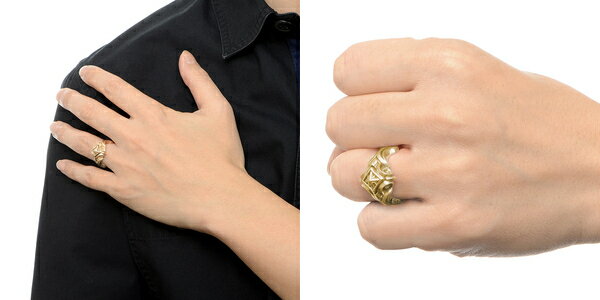 スクエアフォルムのモチーフの真ん中にスタッズを配したk10ygリング。